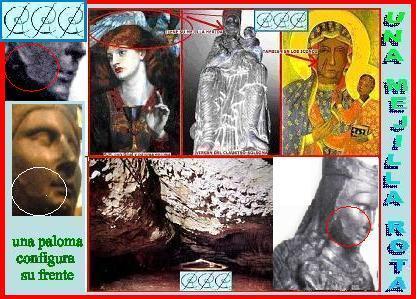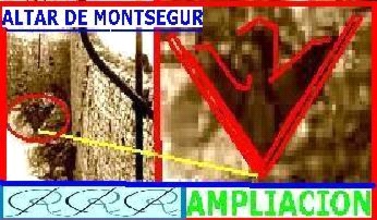 Després de presentar-la en la seguent fotografía om seguirá pensant en la Verge María, pel fet que ella fou la "Mare de Deu". Les penyes dibuixen: un au, volant amb les ales desplegades, sortint d'una forma de lletra (V) uve, que cal entendre como diseny d'un ventre en estat de gravidesa, per inseminar-lo l'Espírit Sant. La idea del Sant Greal hi resta dons representada, en ser el descendent de Jesus de Natzaret.